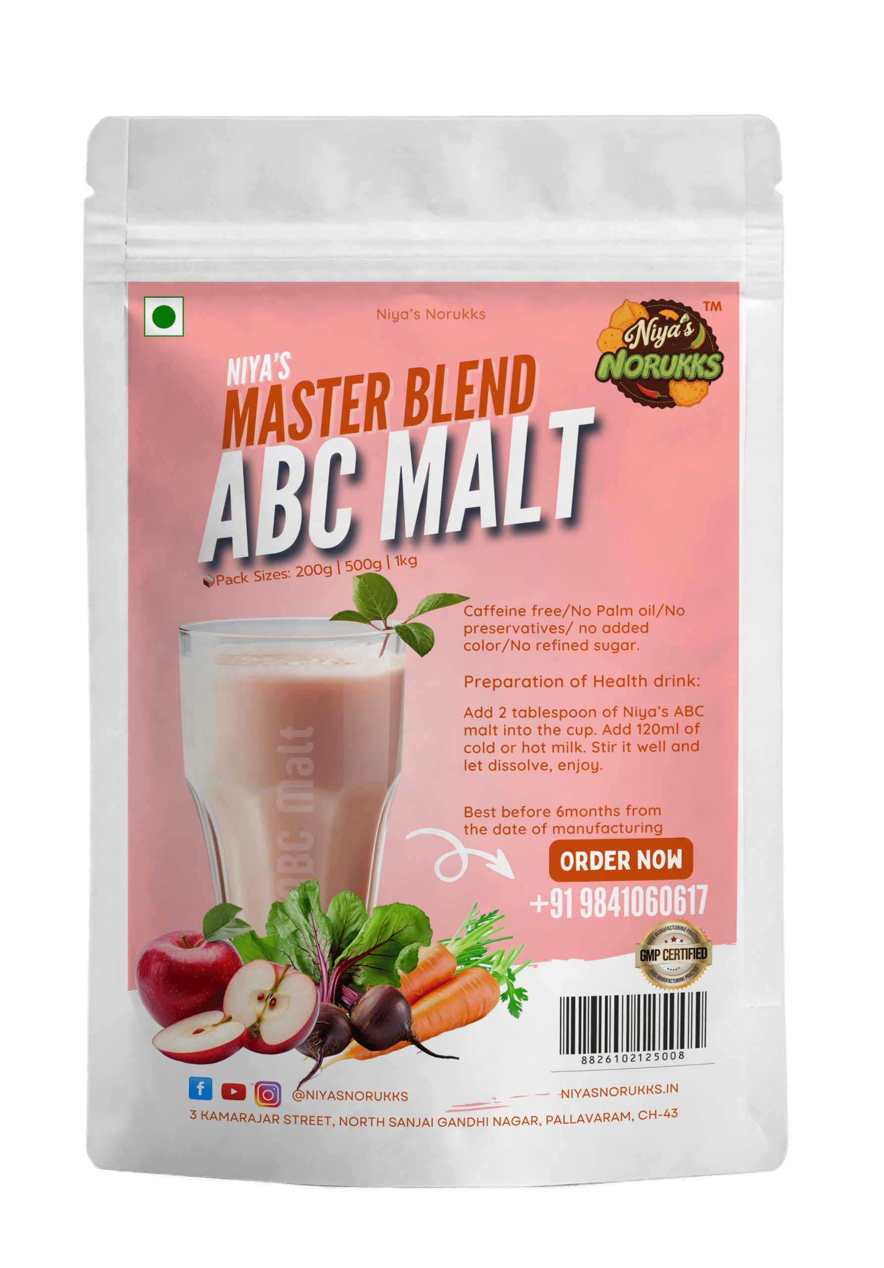 A wholesome blend of Apple, Beetroot, Carrot, Nuts, and Cardamom, Niya’s ABC Malt is your everyday dose of natural energy and nutrition. Made with 100% organic ingredients, this malted drink mix is packed with plant-based protein, essential minerals. Whether served warm or chilled, ABC Malt is perfect for all ages (Above 9 months) — free from additives, refined sugar, or artificial flavoring. Just pure, honest nourishment in every scoop.