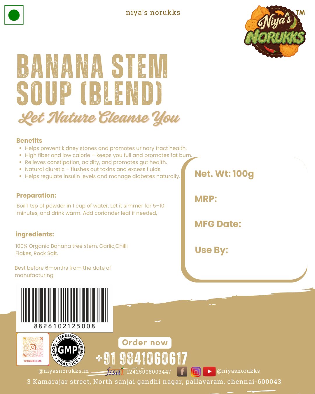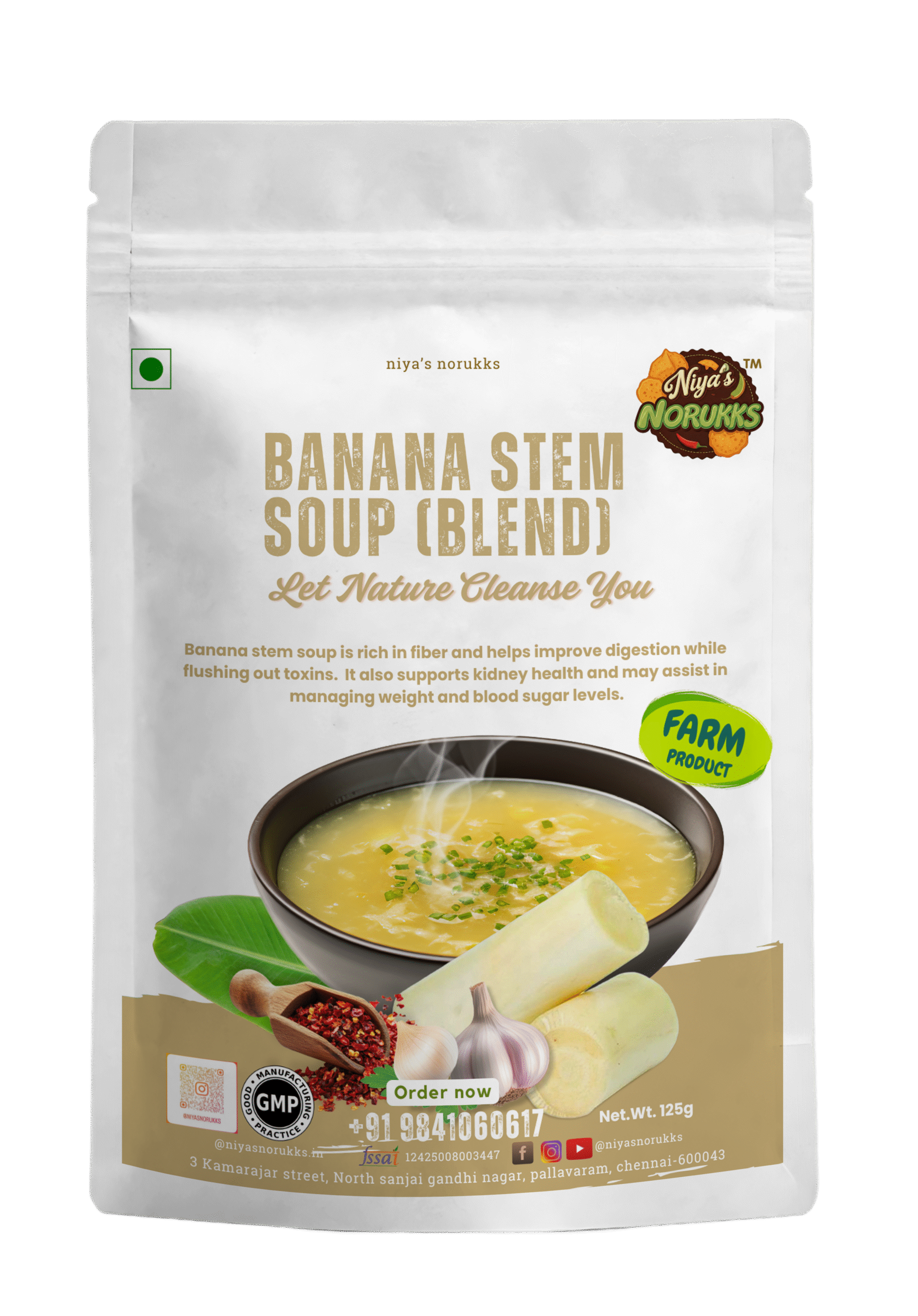 Banana stem is rich in soluble and insoluble fiber, making it excellent for digestion, weight management, and reducing acidity. Its natural cooling effect helps balance the body’s heat and promotes overall wellness.