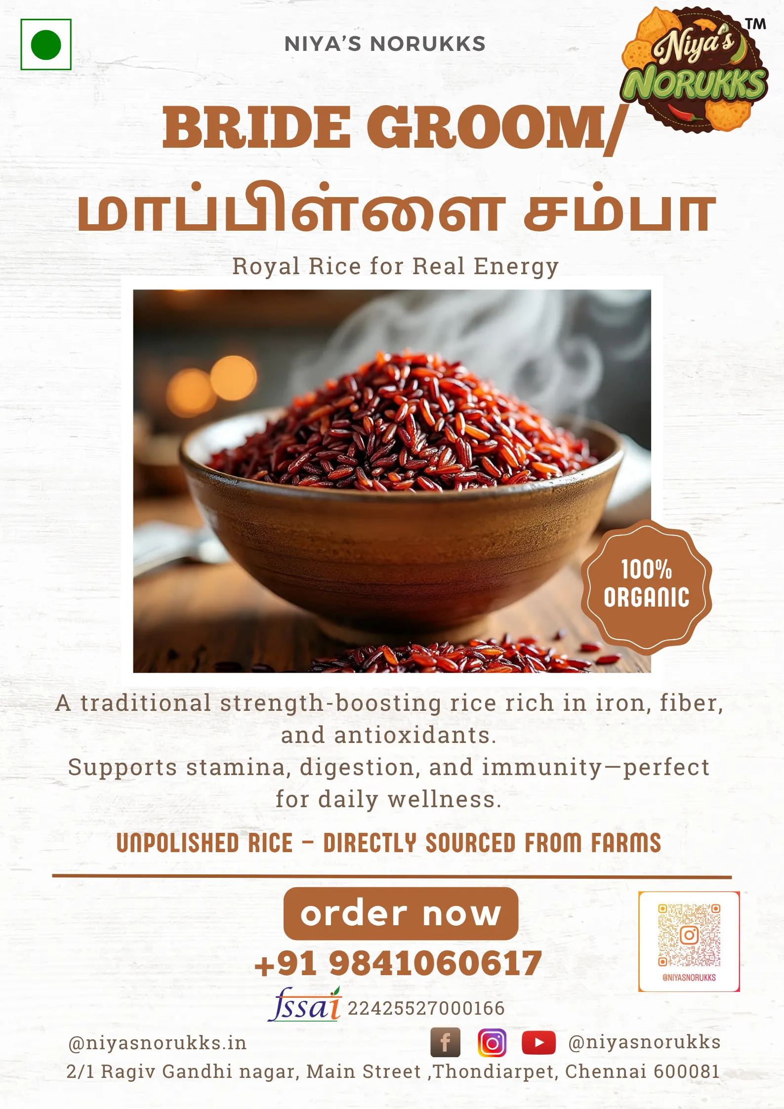Inspired by traditional wisdom, Bride-Groom Rice is a special organic rice blend carefully curated to nourish newlyweds with strength, stamina, and natural vitality. Rich in iron, zinc, antioxidants, and slow-releasing energy, this rice supports overall wellness and reproductive health during the most important phase of life. Made from naturally grown, heritage rice varieties known for their restorative and strengthening properties, this blend is ideal for preparing kanji, rice meals, or traditional health porridges.