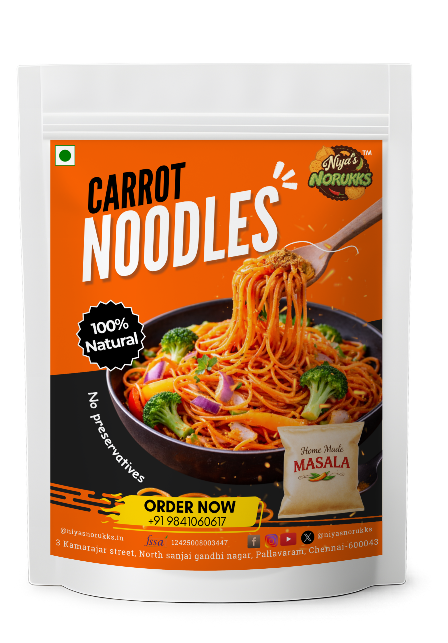 Quick and easy to cook, Carrot Noodles absorb flavours well and complement Indian, Asian, and continental recipes. Free from artificial colours and flavours, they are an ideal choice for health-conscious families seeking clean-label, vegetable-infused food products.