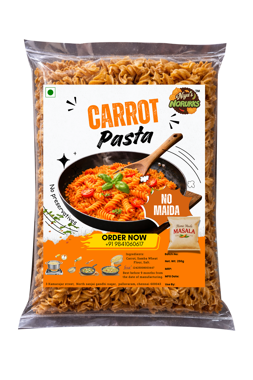 Appealing in colour and flavour, Carrot Pasta is ideal for both children and adults and works beautifully with Indian and continental sauces. It cooks evenly, holds sauces well, and makes everyday meals more nutritious without compromising on taste.