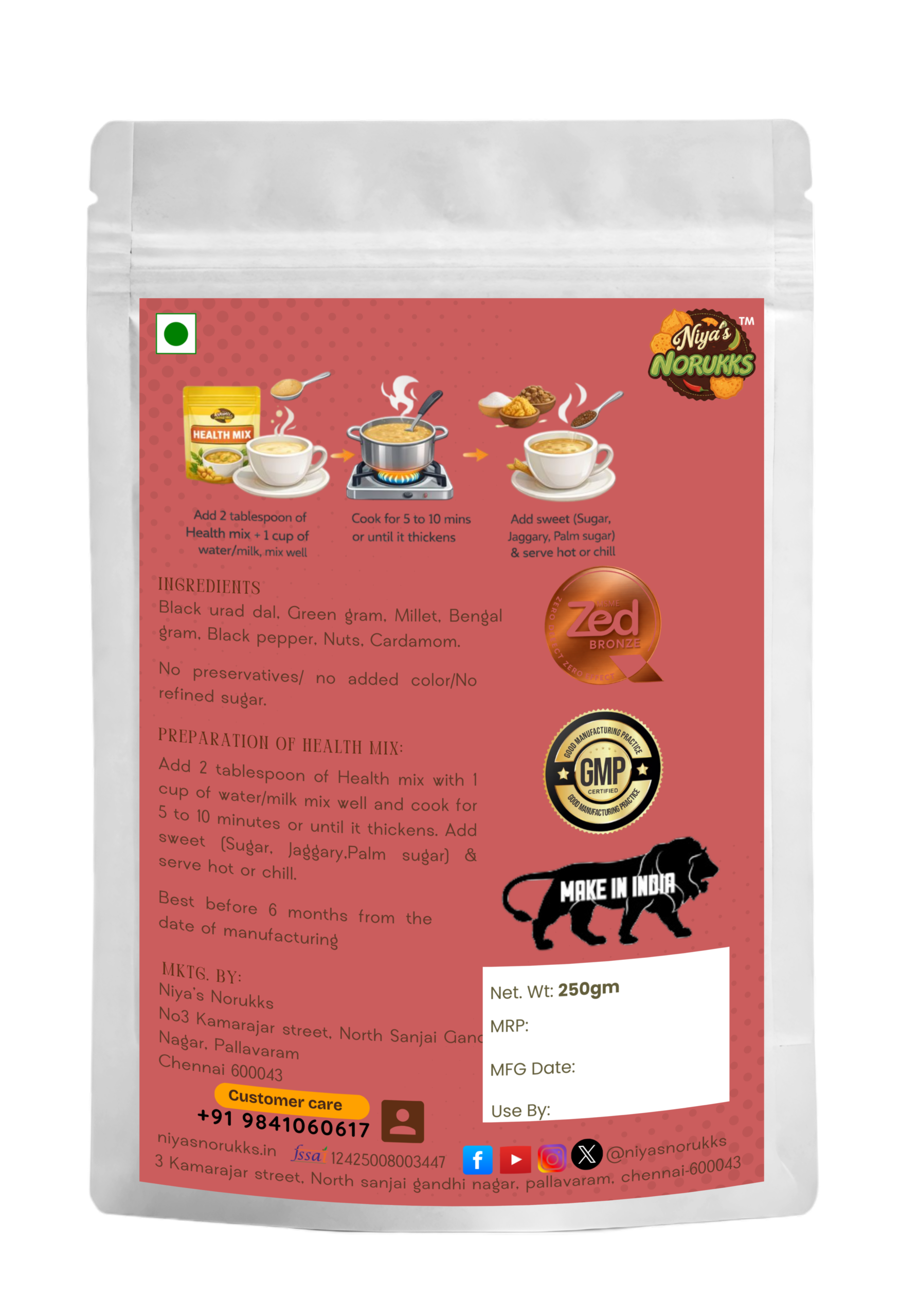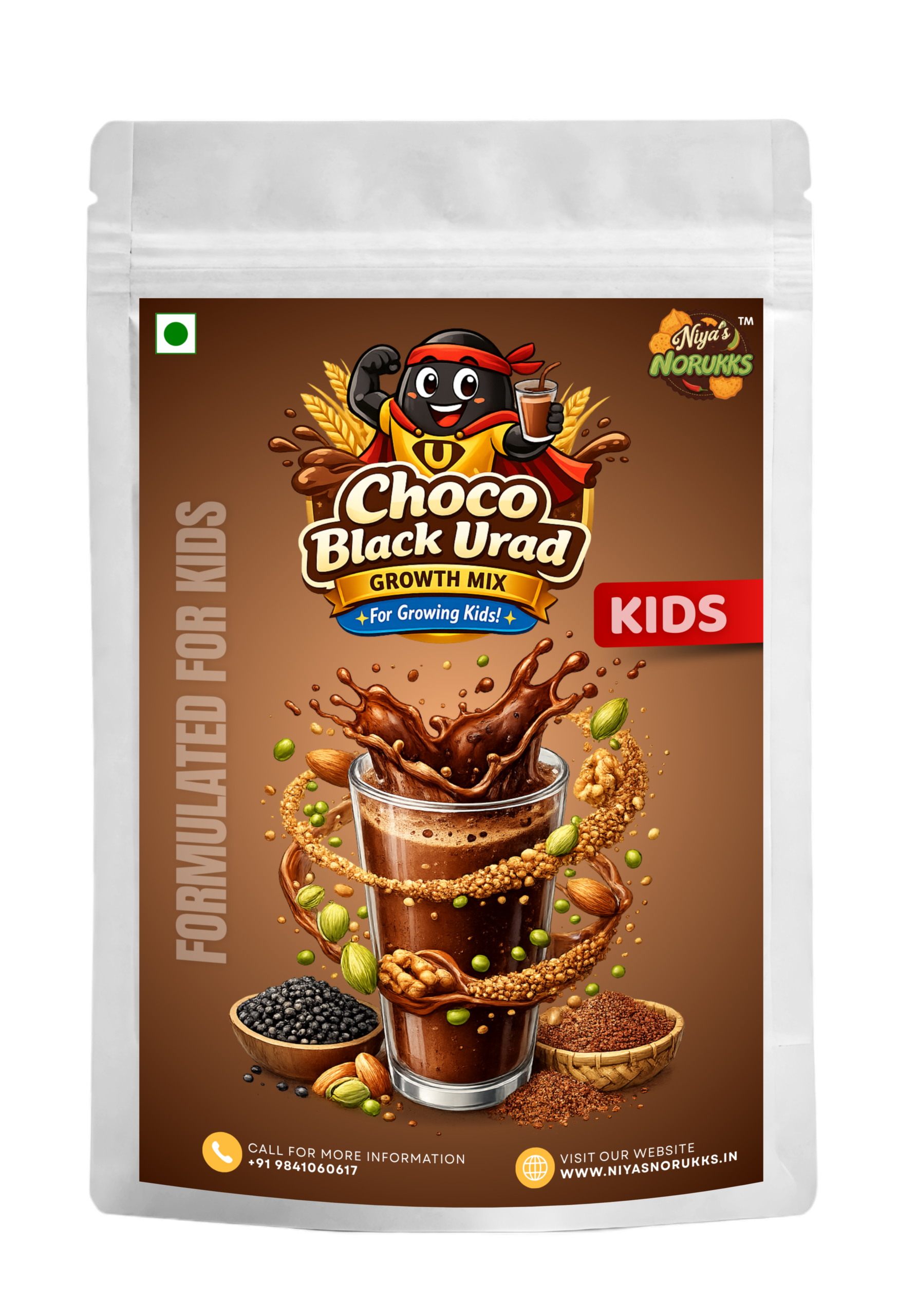 Choco Blackurad Growth Mix is a power-packed, nutrient-rich health blend thoughtfully made from black urad dal, ragi (finger millet), cocoa powder, dry ginger, and cardamom. Black urad dal provides high-quality plant protein, iron, and essential minerals that support muscle strength and overall growth. Ragi is a natural source of calcium and fiber, helping in bone development and sustained energy release. The addition of cocoa powder gives a delicious chocolaty flavor that makes the mix enjoyable for children and adults alike, while also contributing antioxidants. Dry ginger aids digestion and improves nutrient absorption, and cardamom enhances aroma while supporting gut health. Together, these ingredients create a balanced, tasty, and nourishing growth mix ideal for preparing healthy porridge or energy drinks that promote strength, stamina, and overall wellness.