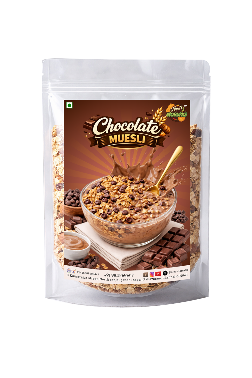 Ideal for both kids and adults, Chocolate Muesli can be enjoyed with milk, yogurt, or as a ready-to-eat snack. It’s the perfect choice for those who want a nutritious breakfast with a touch of chocolatey delight, making healthy eating both fun and flavorful!