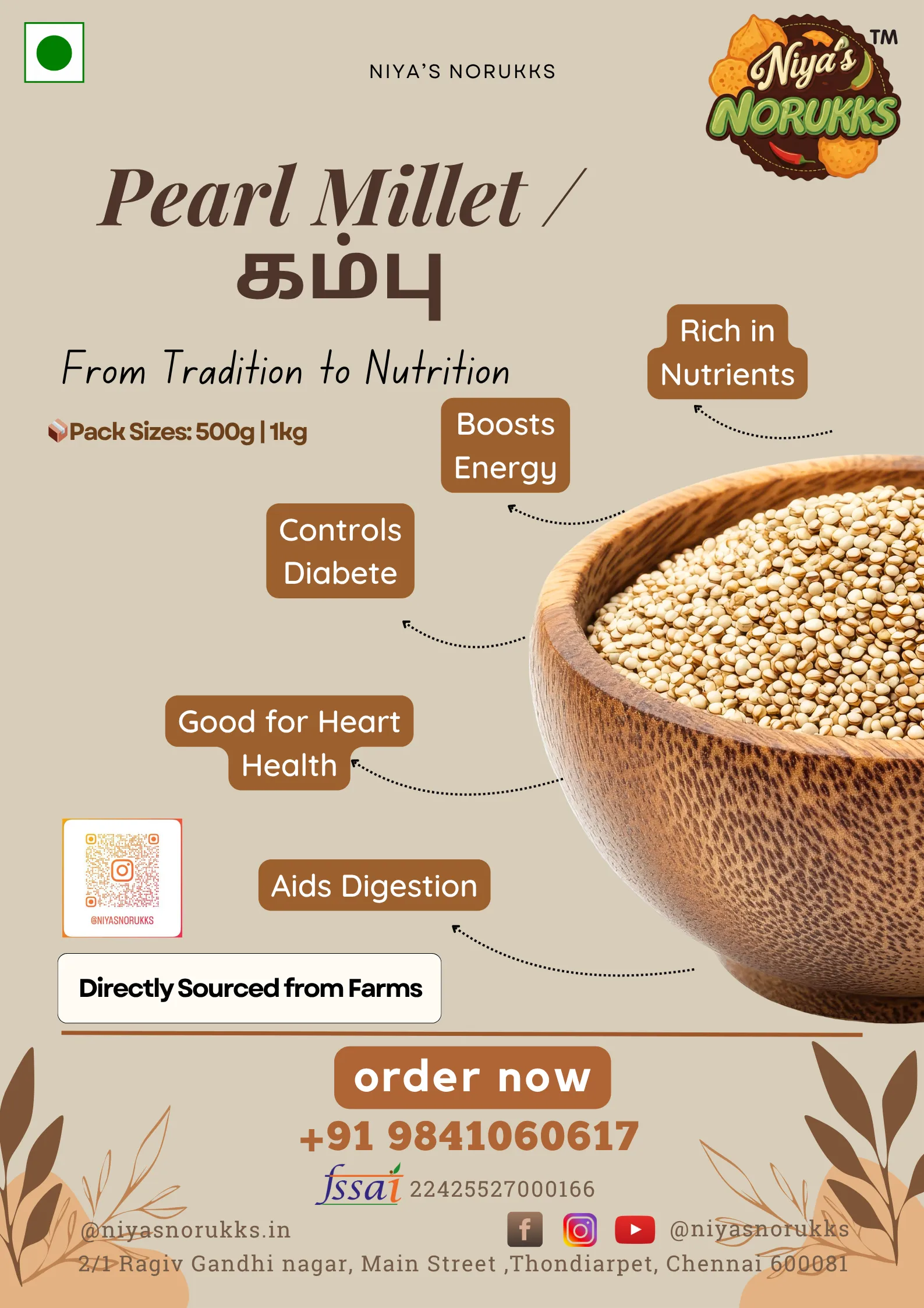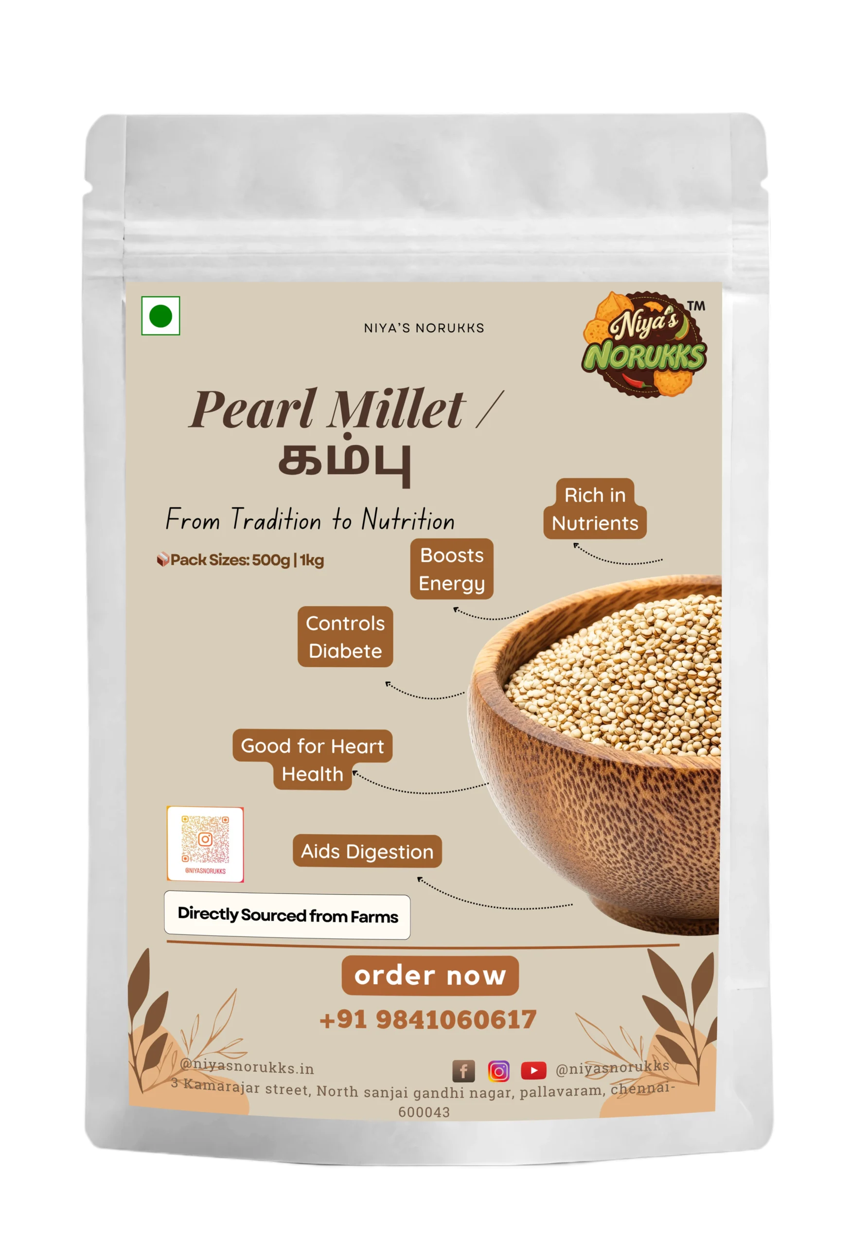 Kambu, also known as Pearl Millet, is a traditional powerhouse grain known for its high energy, iron, and cooling properties. Grown organically and unpolished, Kambu is ideal for promoting strength, stamina, and digestive wellness, especially in hot climates. Naturally gluten-free and rich in fiber, protein, calcium, and magnesium, Kambu supports heart health, weight management, and sustained energy. It’s perfect for making kanji (porridge), dosas, rotis, or healthy meal bowls.