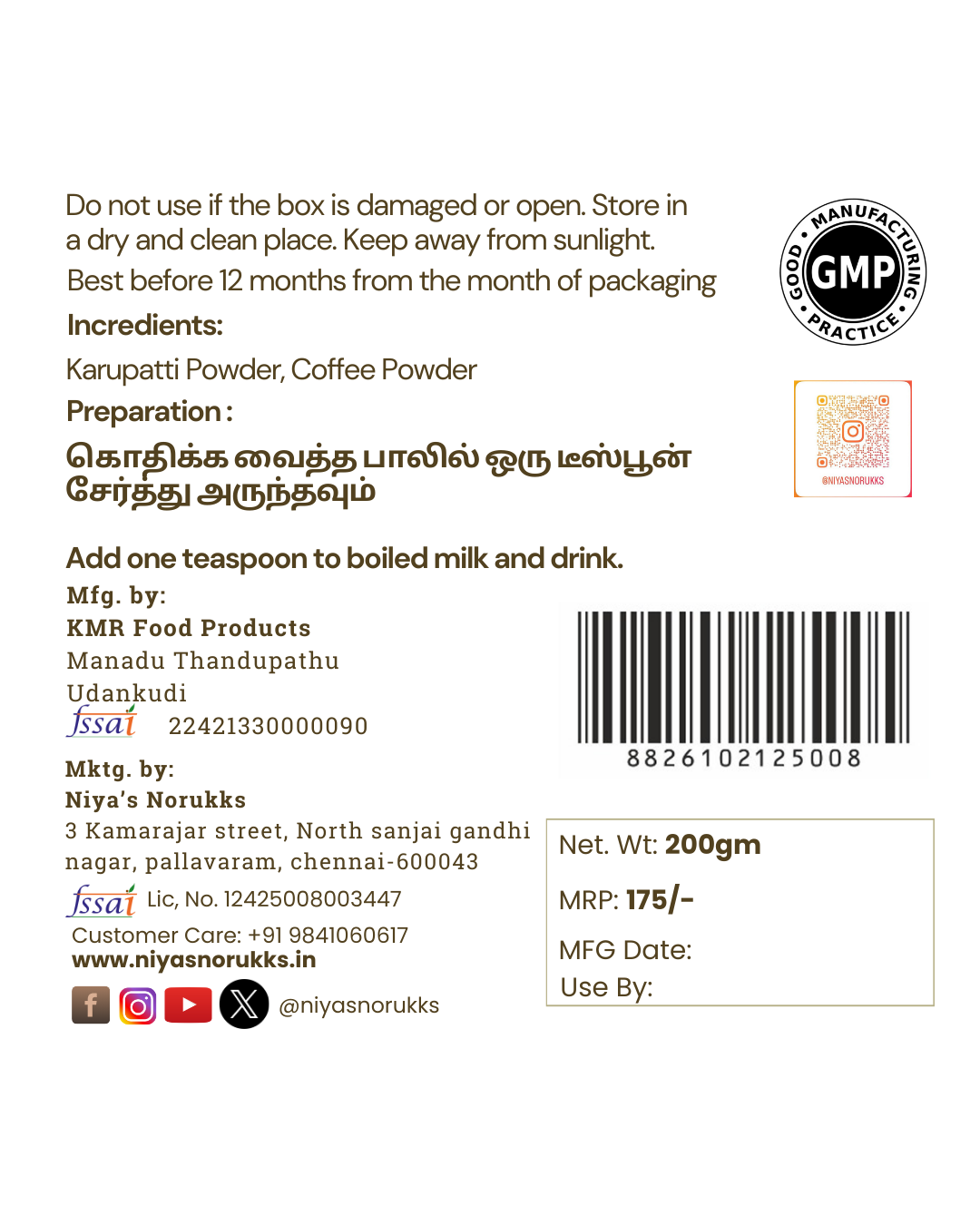 Karupatti Instant Coffee is a pure and natural coffee blend sweetened with traditional Karupatti (Palm Jaggery). Made from premium roasted coffee and chemical-free palm jaggery, this instant mix delivers a rich, authentic taste with wholesome health benefits. Enjoy the smooth aroma of filter-style coffee combined with the warm, earthy sweetness of natural palm sugar—without refined white sugar, additives or preservatives.