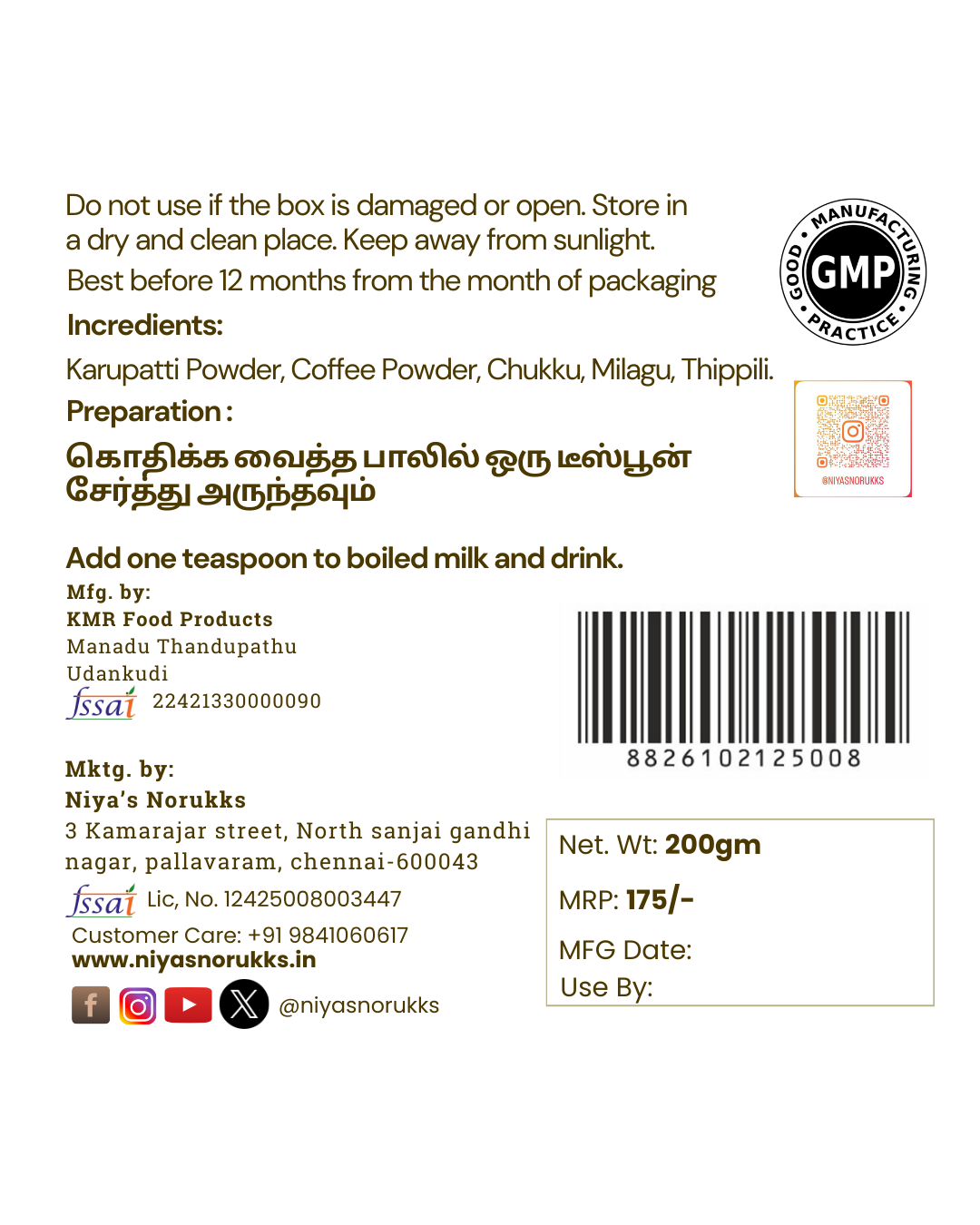 A powerful traditional herbal wellness coffee, crafted with natural palm jaggery, palm candy, and immunity-boosting spices like Chukku (dry ginger), Milagu (black pepper), and Thippili (long pepper). This ancient Siddha-inspired blend supports respiratory health, improves digestion, and energizes the body while offering a strong aromatic taste and natural sweetness.