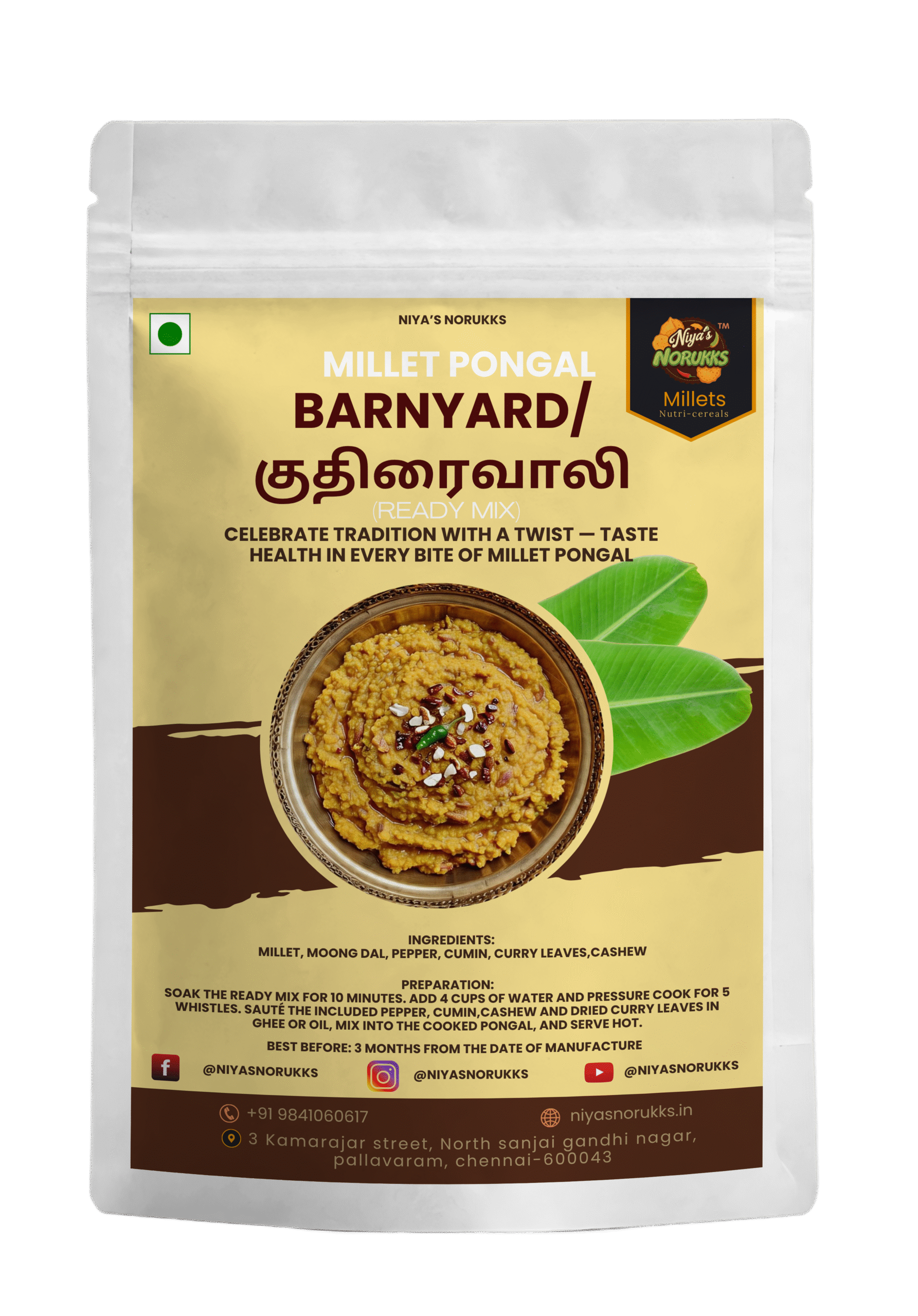 Wholesome tradition made simple! Niya’s Kuthiraivali Pongal Ready Mix brings you the light, nourishing goodness of Barnyard Millet (Kuthiraivali) blended with organic moong dal, black pepper, cumin, and curry leaves — perfectly seasoned for a quick, satisfying Pongal. Naturally gluten-free and low in calories, barnyard millet is known for its high fiber, iron, and calcium content, making it a smart choice for health-conscious meals that don’t compromise on taste.