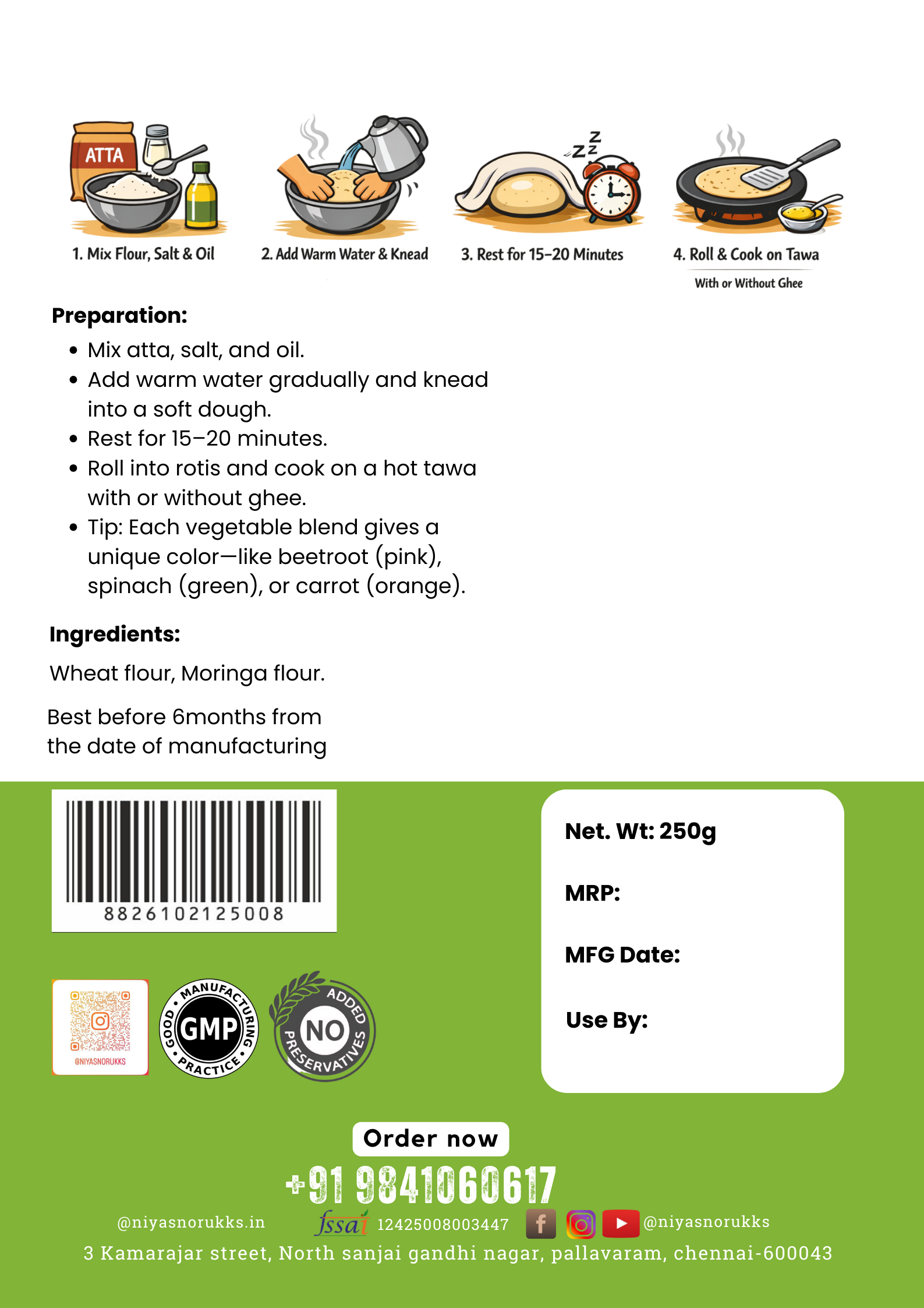 Moringa, known as the “Miracle Tree,” supports immunity, improves metabolism, enhances energy levels, and promotes overall wellness. When combined with fiber-rich whole wheat, it becomes an excellent choice for families looking for healthier, cleaner, and more functional food options.