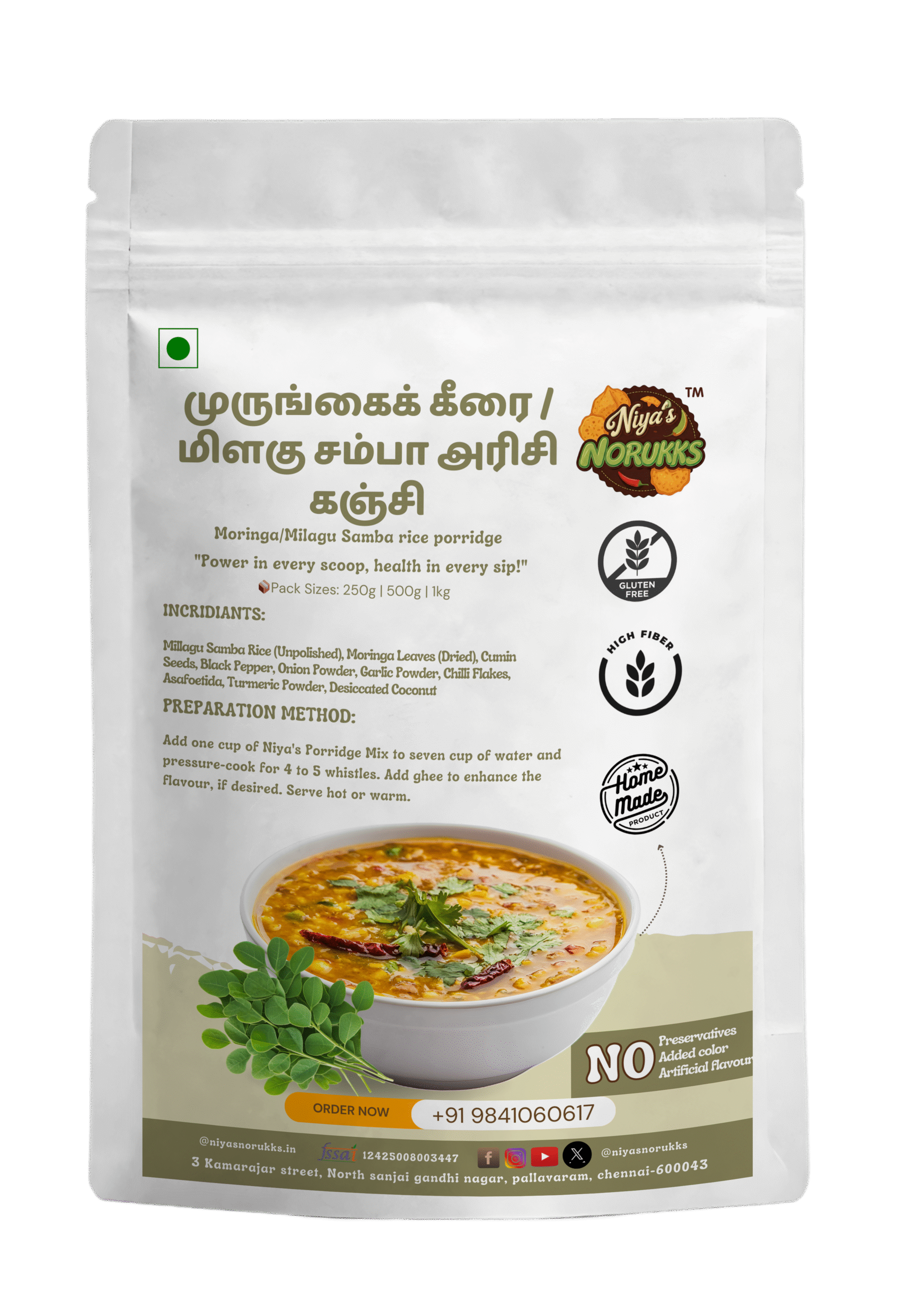 Moringa Leaves with Milagu Samba Kanji Mix is a wholesome traditional blend made from aromatic Milagu Samba rice and nutrient-rich moringa leaves. This mix helps improve digestion, boost immunity, relieve cold and cough, and provide natural strength and warmth to the body. Easy to prepare and suitable for all ages, it delivers delicious traditional flavor and powerful daily nutrition—perfect for a healthy breakfast or comforting evening kanji.
