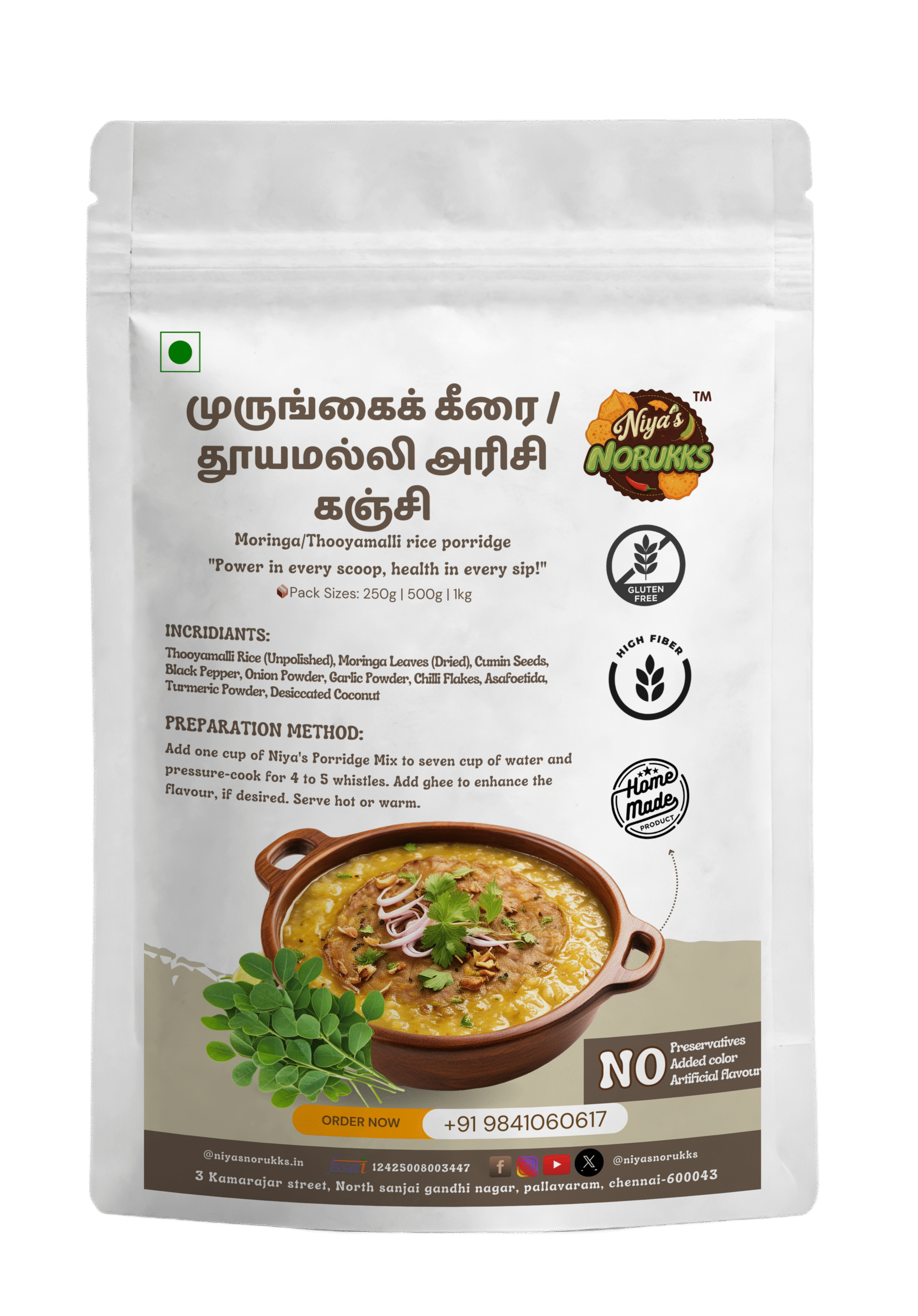 Moringa Leaves with Thooyamalli Rice Kanji Mix is a premium traditional health blend made using aromatic Thooyamalli rice together with nutrient-rich moringa leaves. Thooyamalli rice is celebrated for its natural ability to strengthen the nervous system, improve digestion, enhance stamina, and support heart health, while moringa provides powerful vitamins, calcium, iron, and antioxidants that help boost immunity, improve hemoglobin levels, and support healthy bones. This wholesome combination delivers long-lasting energy, keeps the body active, and promotes overall wellness with every serving. With its mild aroma, smooth texture, and naturally delicious flavor, this kanji mix is easy to prepare and suitable for all age groups, making it an ideal choice for a nourishing breakfast or a refreshing evening health drink. Enjoy the perfect blend of traditional taste and complete daily nutrition.