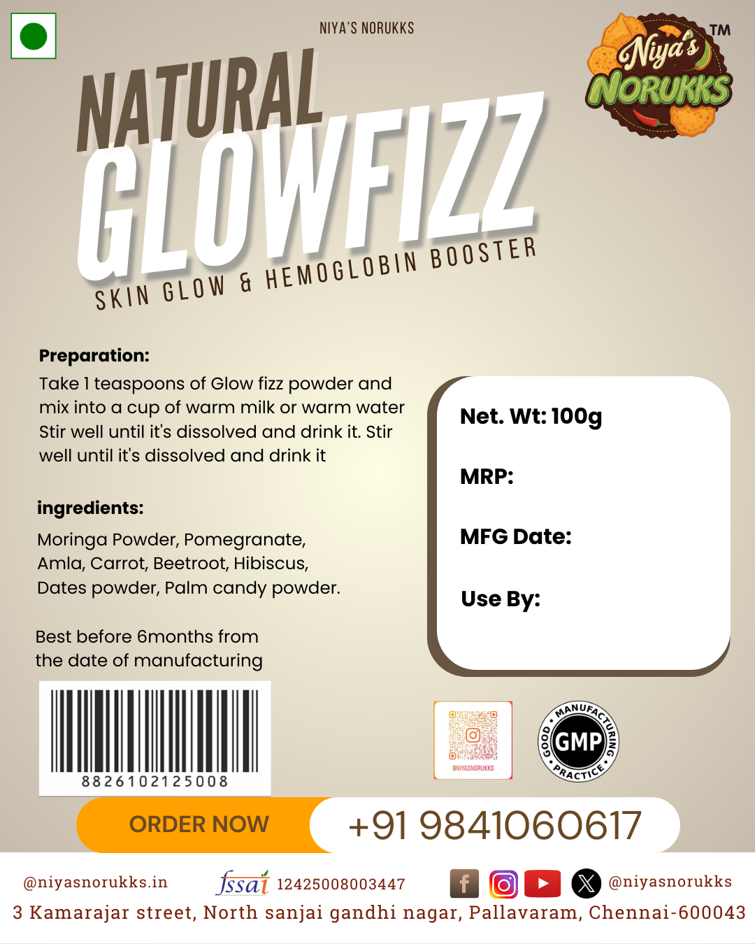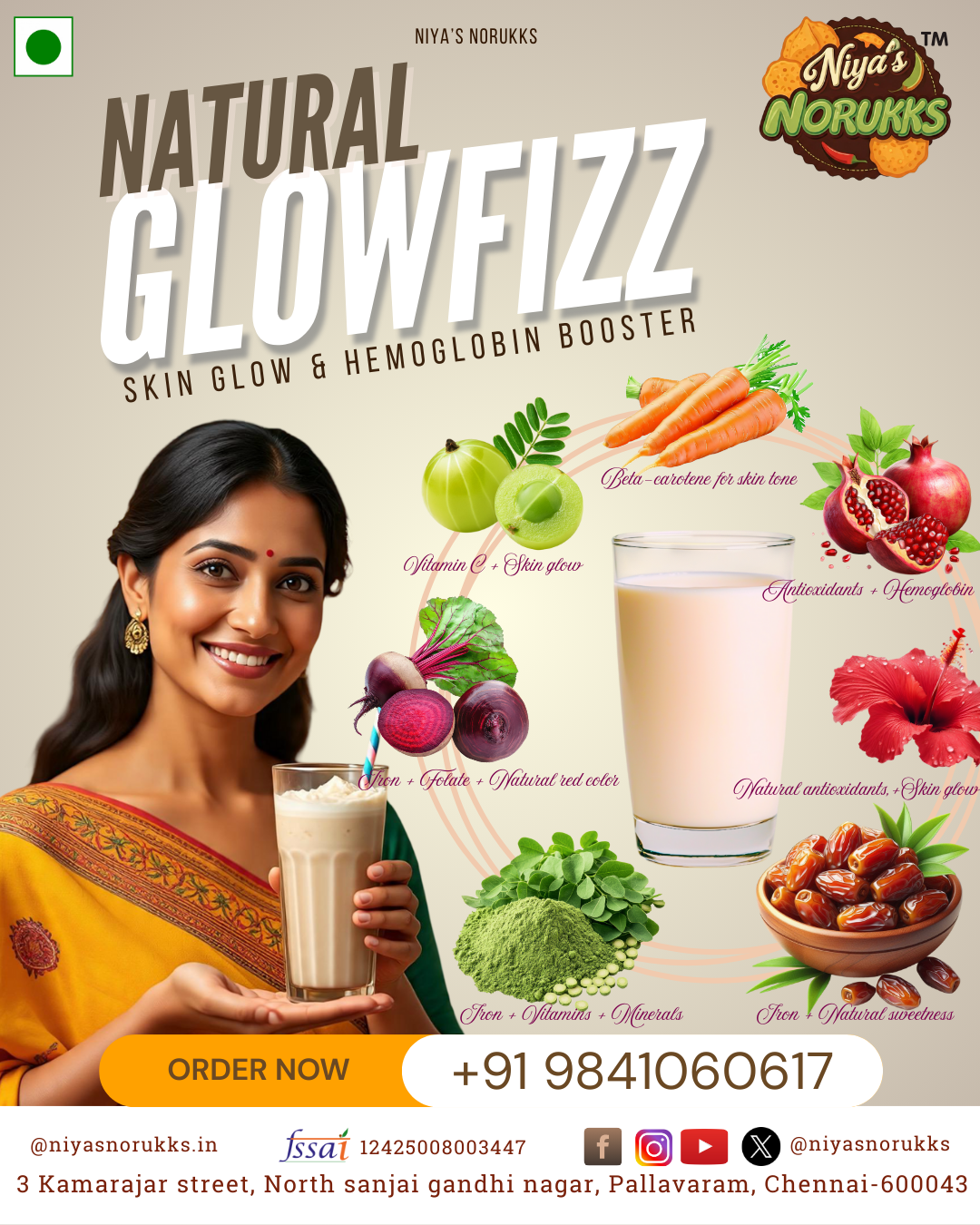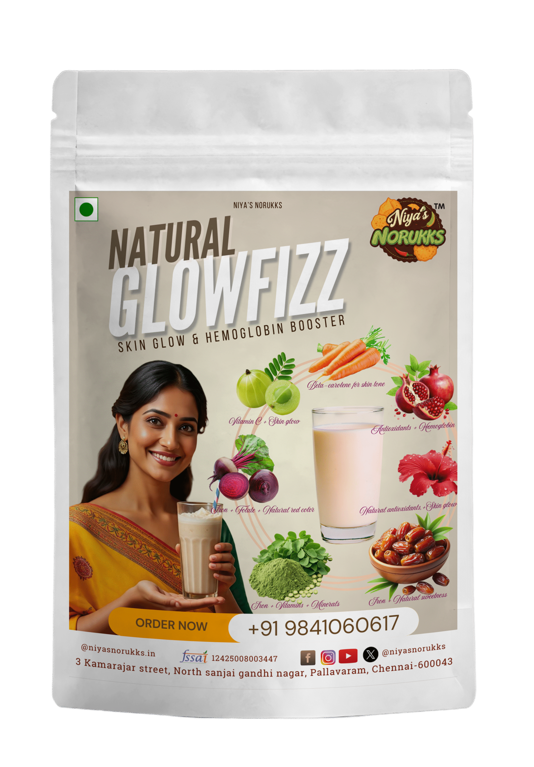 Natural Glowfizz – A refreshing blend of beetroot, carrot, hibiscus, amla, dates, pomegranate, moringa, and coconut sugar for natural energy and inner glow.