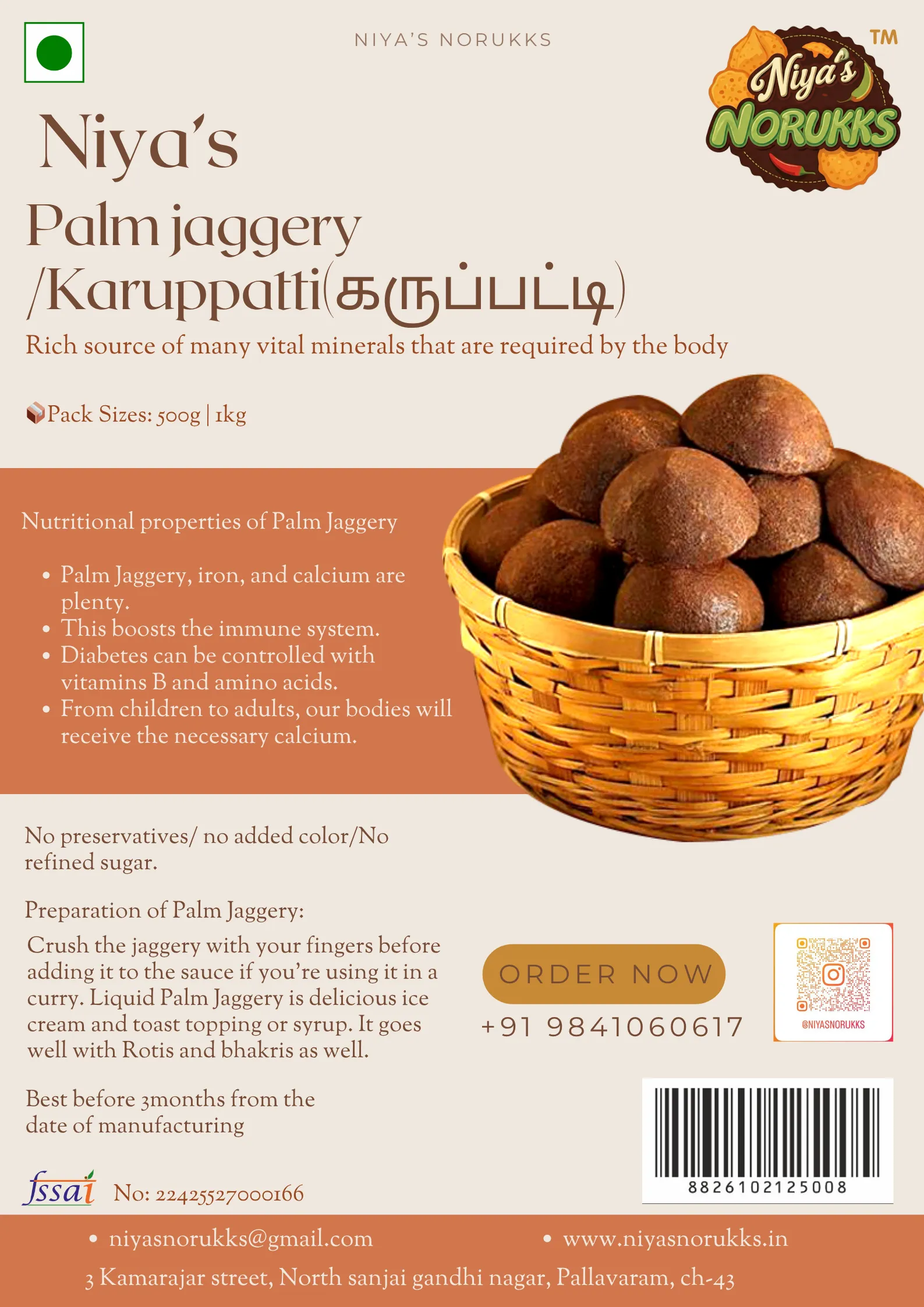 Crafted from the sweet nectar of Palmyra trees, Palm Jaggery (Karuppatti) is a traditional, unrefined sweetener packed with iron, magnesium, and natural minerals. Unlike white sugar, it is chemical-free, has a low glycemic index, and offers a deep, earthy sweetness with natural health benefits. Used for centuries in South Indian kitchens and Ayurvedic remedies, it’s perfect for sweetening teas, kashayams, desserts, or even making healthy snacks for kids