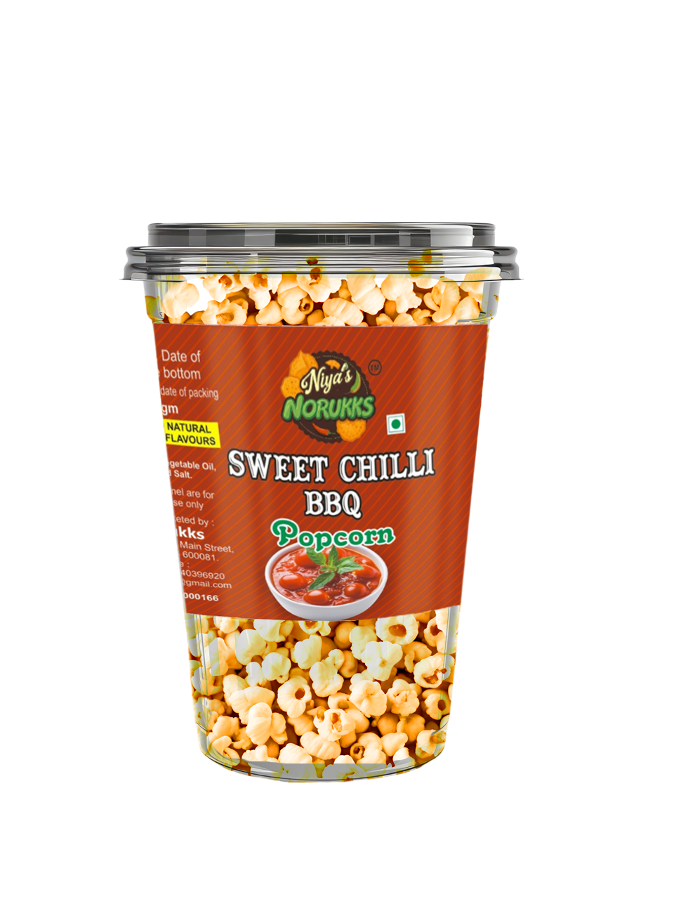 Sweet Chilli BBQ Popcorn – Crispy, crunchy popcorn coated in smoky BBQ flavor with a hint of sweet chilli spice. A perfect balance of sweet, smoky, and mildly spicy in every bite – ready to snack anytime!