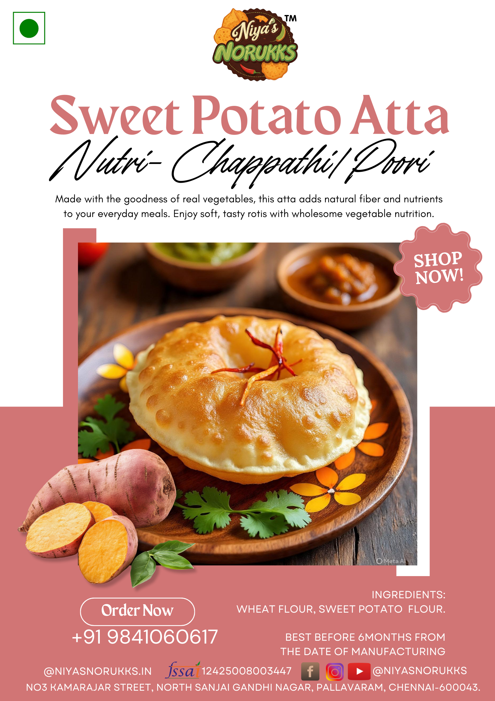 Sweet Potato Infused Atta is a healthy flour mix made by blending grains with nutrient-rich sweet potato. It gives soft, tasty rotis and provides natural energy, fiber, and vitamins. This atta helps improve digestion and supports immunity, making it a good choice for both kids and adults. Enjoy a healthy and delicious meal every day.