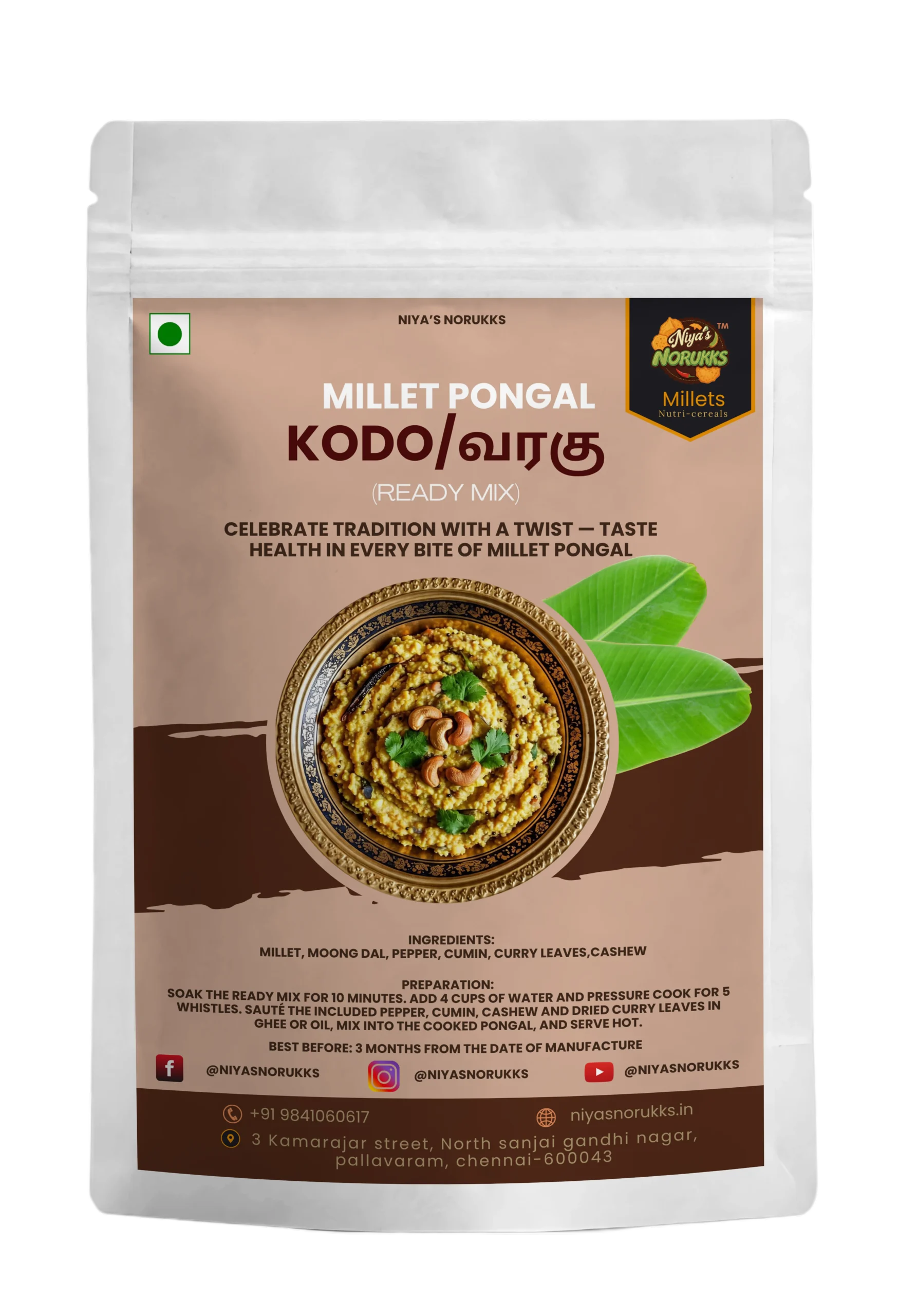 Enjoy the wholesome comfort of traditional Pongal made easy! Niya’s Varagu Pongal Ready Mix combines handpicked Kodo millet (Varagu) with a flavorful blend of organic moong dal, pepper, cumin, and curry leaves for a nutritious, ready-to-cook South Indian classic. Rich in fiber, protein, and essential minerals, Kodo millet is a perfect rice alternative — ideal for those looking to eat light without sacrificing taste.