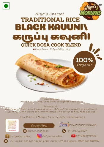 Niya’s Black Kavuni Dosa Blend is a ready-to-use mix made from heritage Black Kavuni rice, known for its rich antioxidants, iron, and natural fiber.